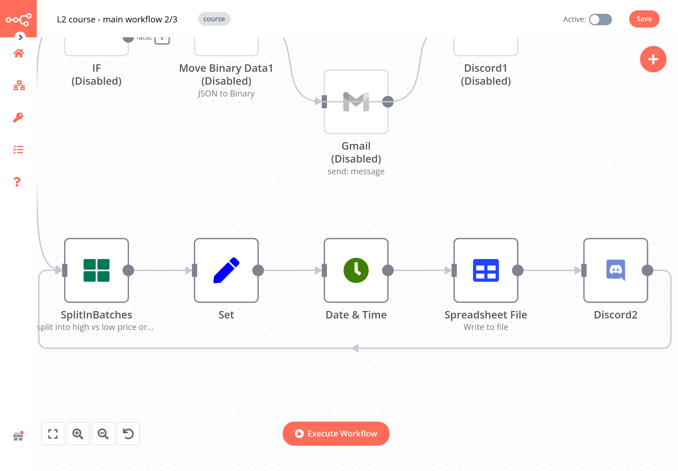- Use the Split In Batches node to split data from the Item Lists node into batches of 5.